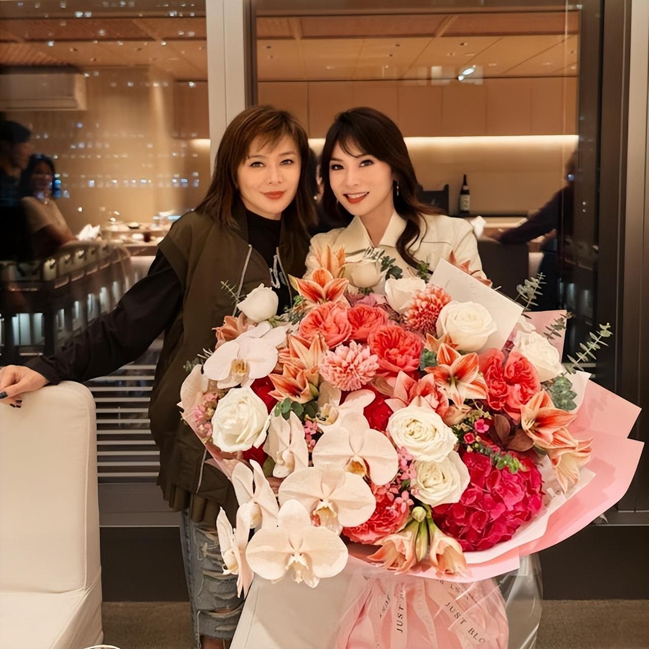关之琳和邱美人在鲜花后面拍照,生日饭局记录下幸福时刻。
