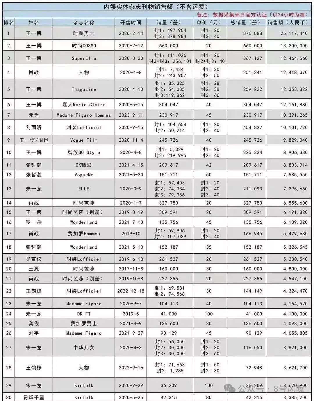 《费加罗男士》金九刊12个小时大卖1000w ,成为2023年杂志销售额唯一破千万的艺人,并且还拿下了内娱24小时杂志销量第七。