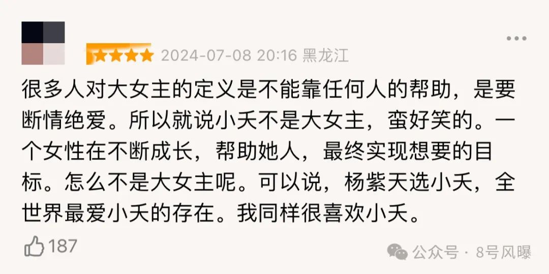 不过也有些人觉得这是女主小夭自我治愈、自我重塑的过程,“谁说大女主就必须断情绝爱”?