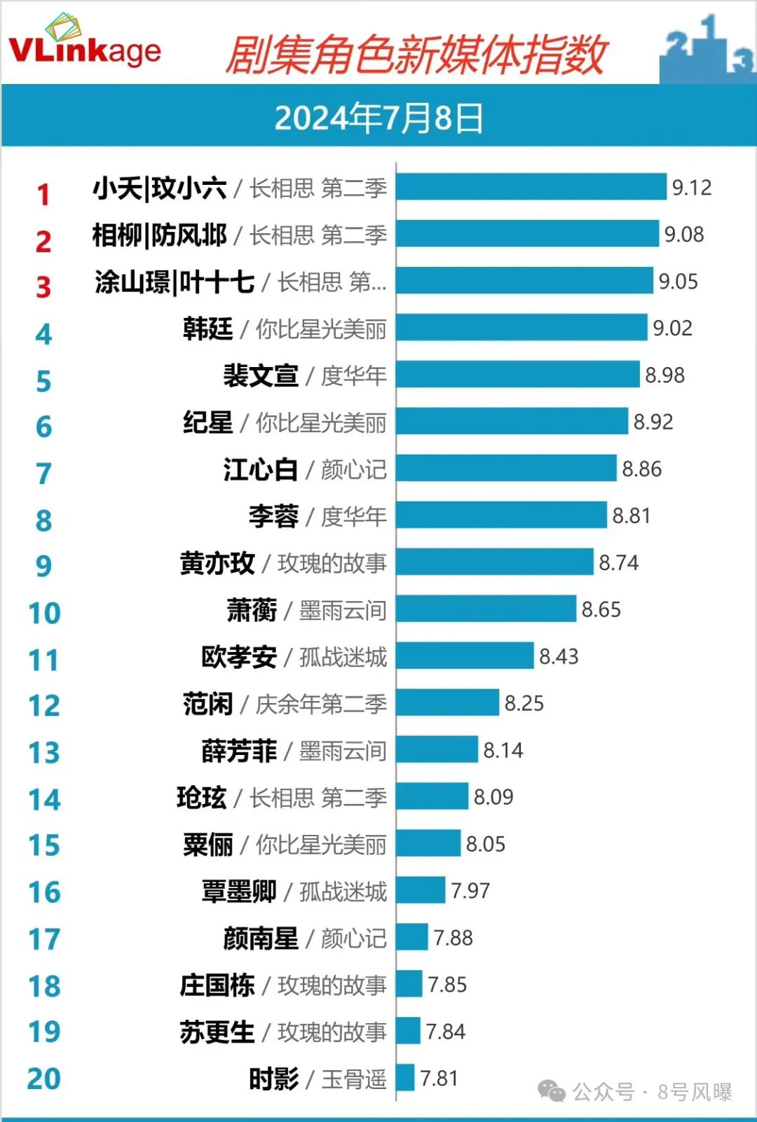 昨晚《长相思2》首播,檀健次的相柳和邓为的涂山璟角色指数分别位于V榜第2和第3,而作为男主的张晚意位列第14,王弘毅则未上榜。