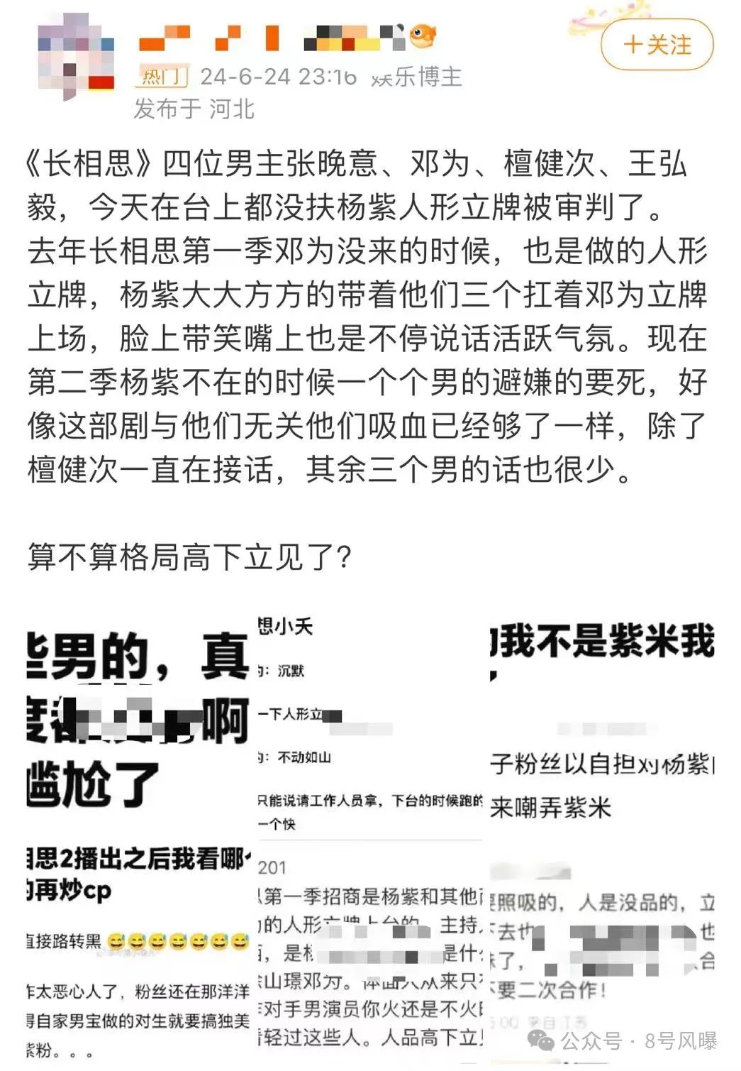有人说《长相思》中是女主杨紫“一带四”,四个男主的走红离不开杨紫在其中发挥作用。但近期,在《长相思2》的宣传活动中,几位男主没人扶杨紫人形立牌的行为受到网友们的审判,有人说“不扶是怕被骂倒贴”,有人说“他们不想炒CP,干脆都不碰”,还有人说“台上哪想那么多,这就是自然反应”。