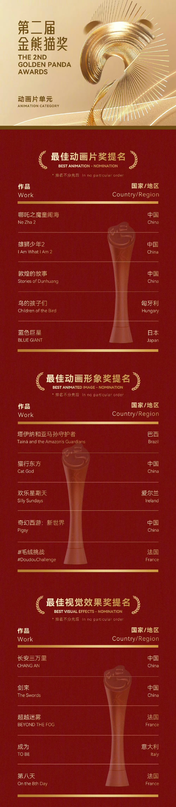日前,第二届金熊猫奖提名公布,朱一龙凭借电影《河边的错误》提名最佳男主角奖;卫诗雅凭借电影《破地狱》提名最佳女主角。《奥本海默》《破地狱》《雪豹》等提名最佳影片。《哪吒之魔童闹海》提名最佳动画片。