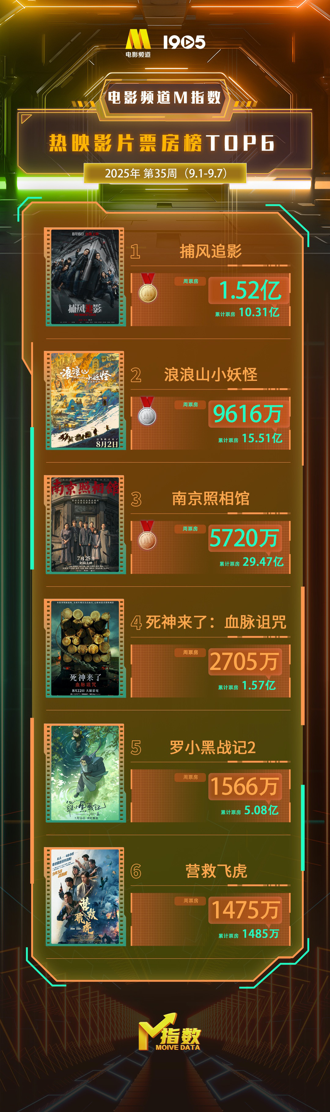 电影频道M指数2025年第35周结果发布。9月1日-9月7日,电影频道M指数热映影片票房榜前6位依次为: