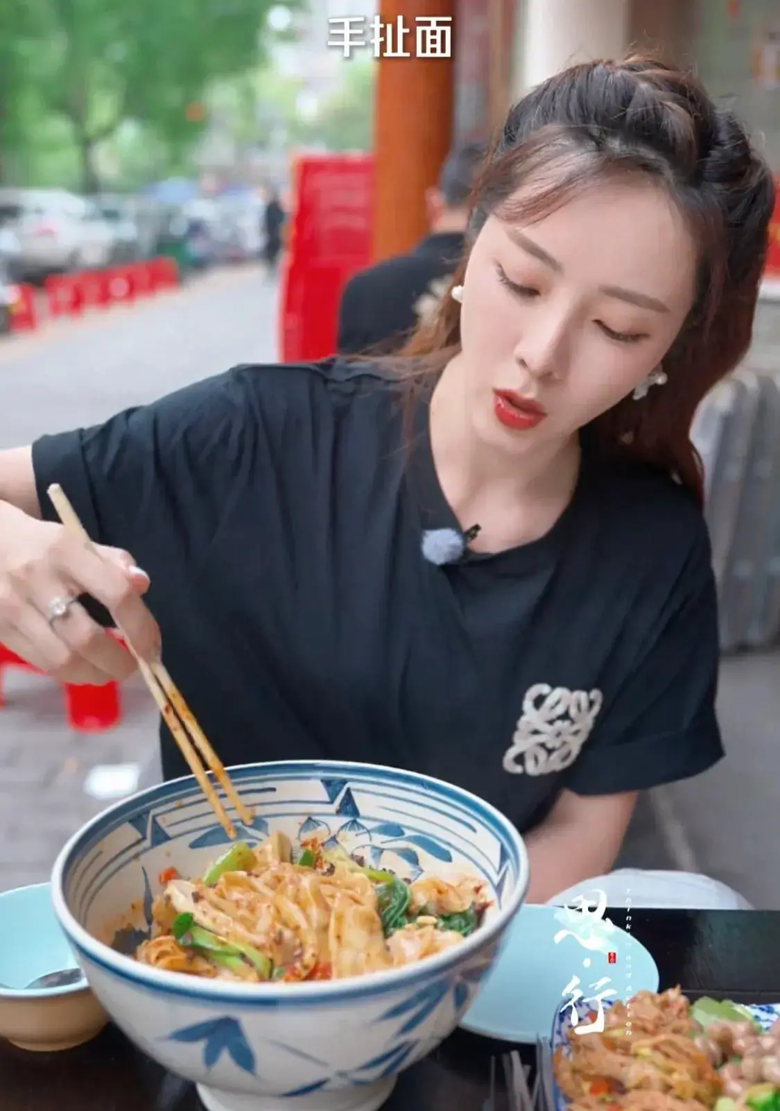 大热天,李思思会不会吃羊肉泡,估计来西安都会吃的,也许女生觉得吃羊肉泡感觉太豪放,所以,没有在视频里出现。不过,李思思给大家分享了自己吃大碗手工扯面的画面: