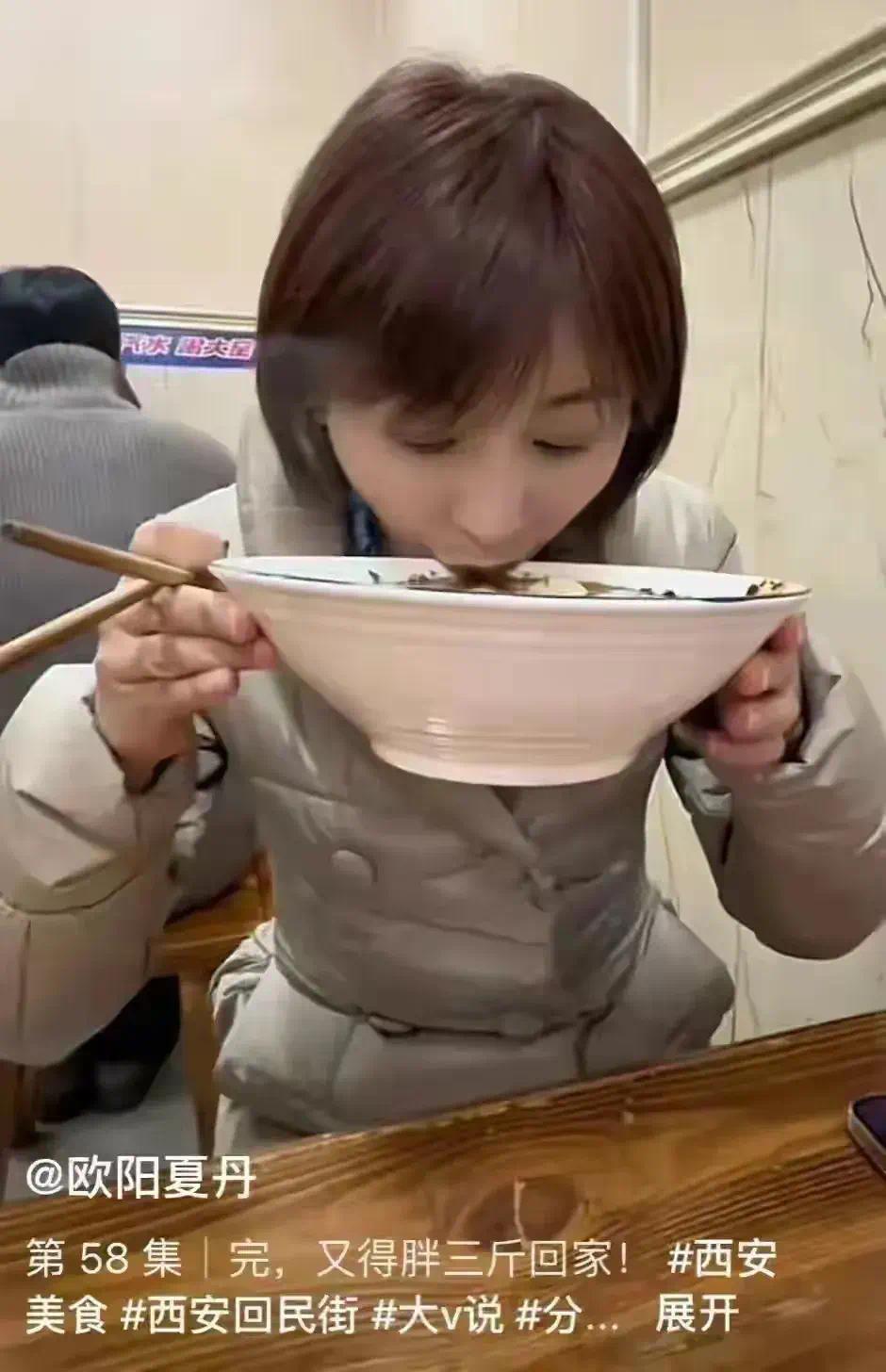 今年春节,欧阳夏丹可是端起大老碗吃羊肉泡馍,还吃了酸汤水饺,看看,欧阳夏丹把汤都喝了。