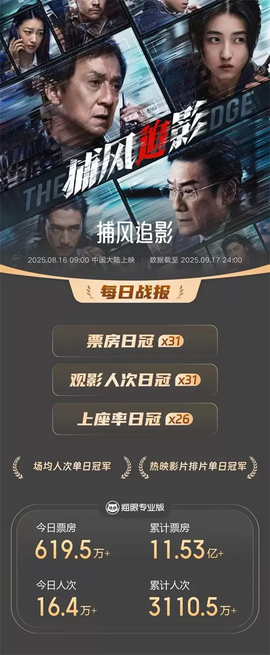 尽管现象级电影《731》的出现,终结了《捕风追影》连续31天夺得票房日冠、观影人次冠军的纪录,但这部自暑期档上映以来总票房突破11亿、位列档期第三的黑马之作,依然交出了一份令人惊喜的成绩单。