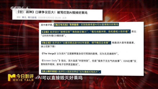 尽管《创》系列拥有深厚的IP底蕴,但《创:战神》上映后,却遭遇了前所未有的尖锐批评。《卫报》直言影片剧情空洞,角色缺乏魅力,毫无戏剧冲突、危机感或人性价值;《独立报》批评其主题深度远逊于1982年的首部,情节晦涩且老套;《波士顿环球报》认为影片引入现实世界后,沦为漫威式的‘残杀片’;《每日电讯报》更是给出了近乎苛刻的评价:烂到我真希望AI可以直接毁灭好莱坞。
