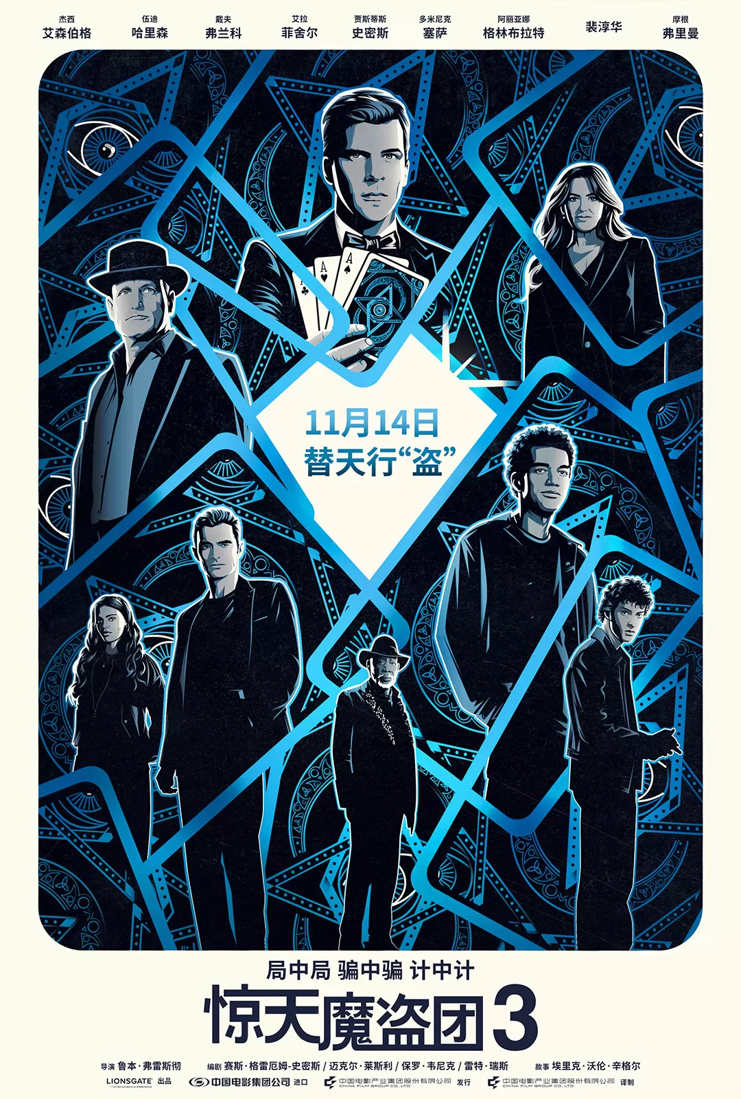 同步曝光的手绘海报也极具巧思,采用天眼卡牌风格的手绘设计,杰西・艾森伯格等骑士团成员与摩根弗里曼等主创悉数亮相。卡牌交织形成血色钻石符号,既暗藏玄机又极具视觉冲击力,预示着这场以魔术设局、替天行盗的大秀即将开演。