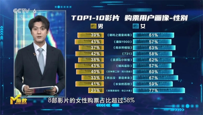 与此同时,她经济持续发力。2025年TOP10影片中,8部影片的女性购票占比超过58%,《射雕英雄传:侠之大者》更达到77%。女性观众不仅在爱情片中占据主导,更在武侠、历史等传统男性向题材中成为消费主力。