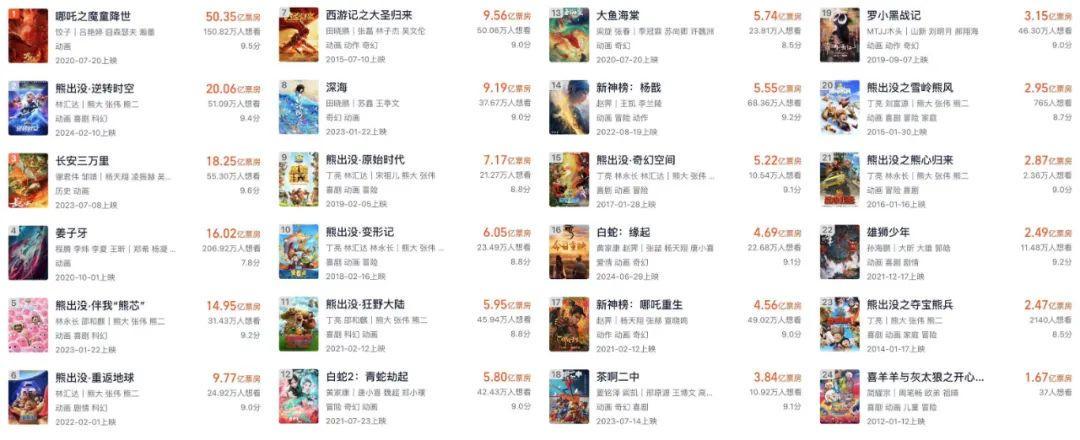 在国产动画电影票房TOP20中,以“哪吒”、“姜子牙”、“西游记”、“白蛇传”等家喻户晓的公版IP为基础改编的动画电影数量达到7部,国产合家欢大IP“熊出没”又独自占据8个席位,《茶啊二中》《罗小黑战记》则改编自具备一定基本盘的热门动画作品。