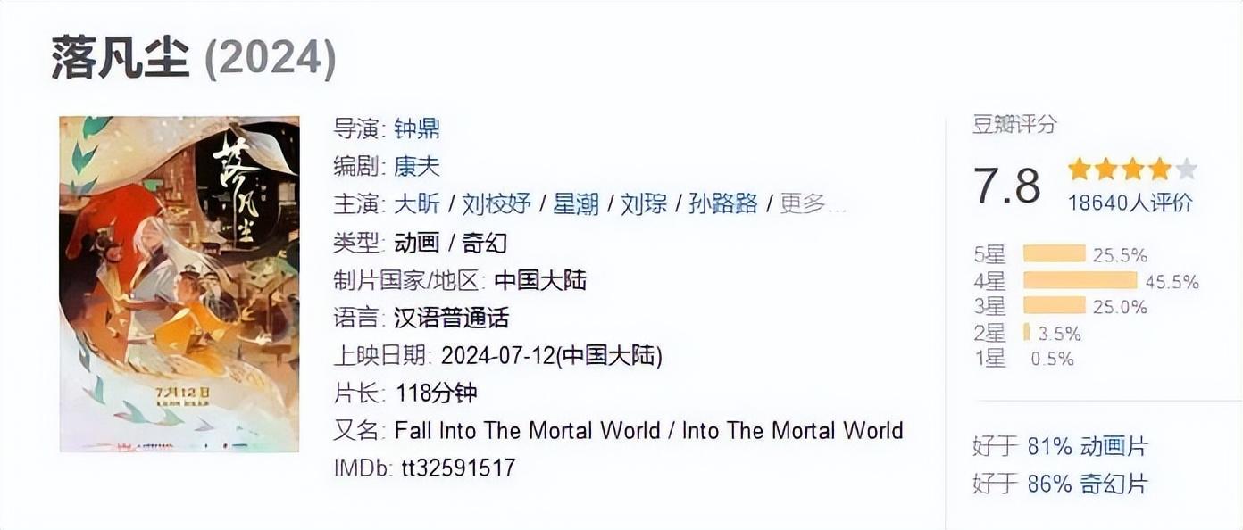 特别是《落凡尘》,在获得豆瓣7.7的开分后还依靠过硬品质二度上涨至7.8分,至今仍是今年暑期档国产新片中口碑最高的一部。