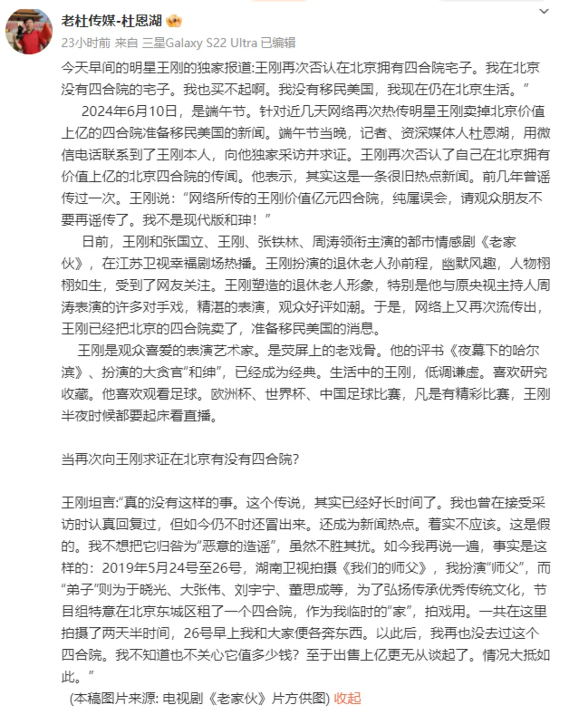 当媒体人再次向王刚求证在北京有没有四合院,王刚坦言:“真的没有这样的事。这个传说,其实已经好长时间了。我也曾在接受采访时认真回复过,但如今仍不时还冒出来。还成为新闻热点。着实不应该。这是假的。我不想把它归咎为“恶意的造谣”,虽然不胜其扰。如今我再说一遍,事实是这样的:2019年5月24号至26号,湖南卫视拍摄《我们的师父》,我扮演“师父”,而“弟子”则为于晓光、大张伟、刘宇宁、董思成等,为了弘扬传承优秀传统文化,节目组特意在北京东城区租了一个四合院,作为我临时的“家”,拍戏用。一共在这里拍摄了两天半时间,26号早上我和大家便各奔东西。以此后,我再也没去过这个四合院。我不知道也不关心它值多少钱?至于出售上亿更无从谈起了。情况大抵如此。”