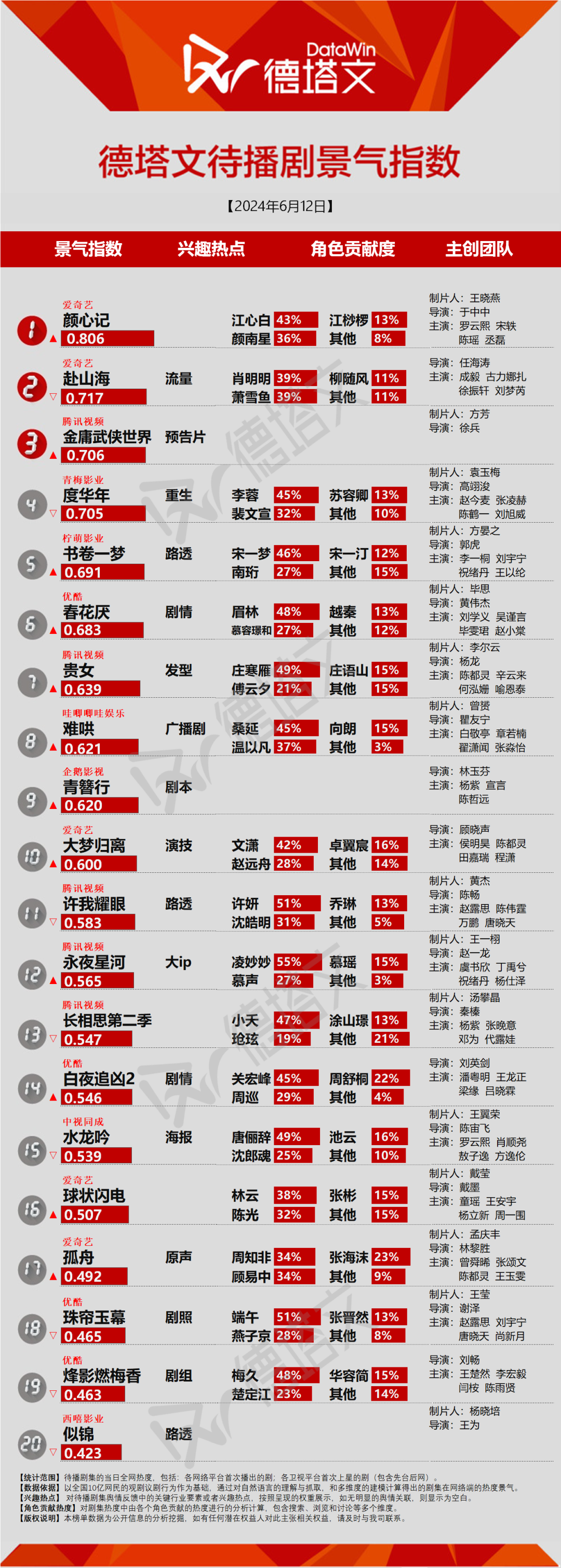 1、德塔文剧集景气指数计算剧集的全网讨论度、网友互动量、媒体曝光率,网络口碑等要素,致力于反映最真实的剧集热度,是行业更先进的剧集热度指标;