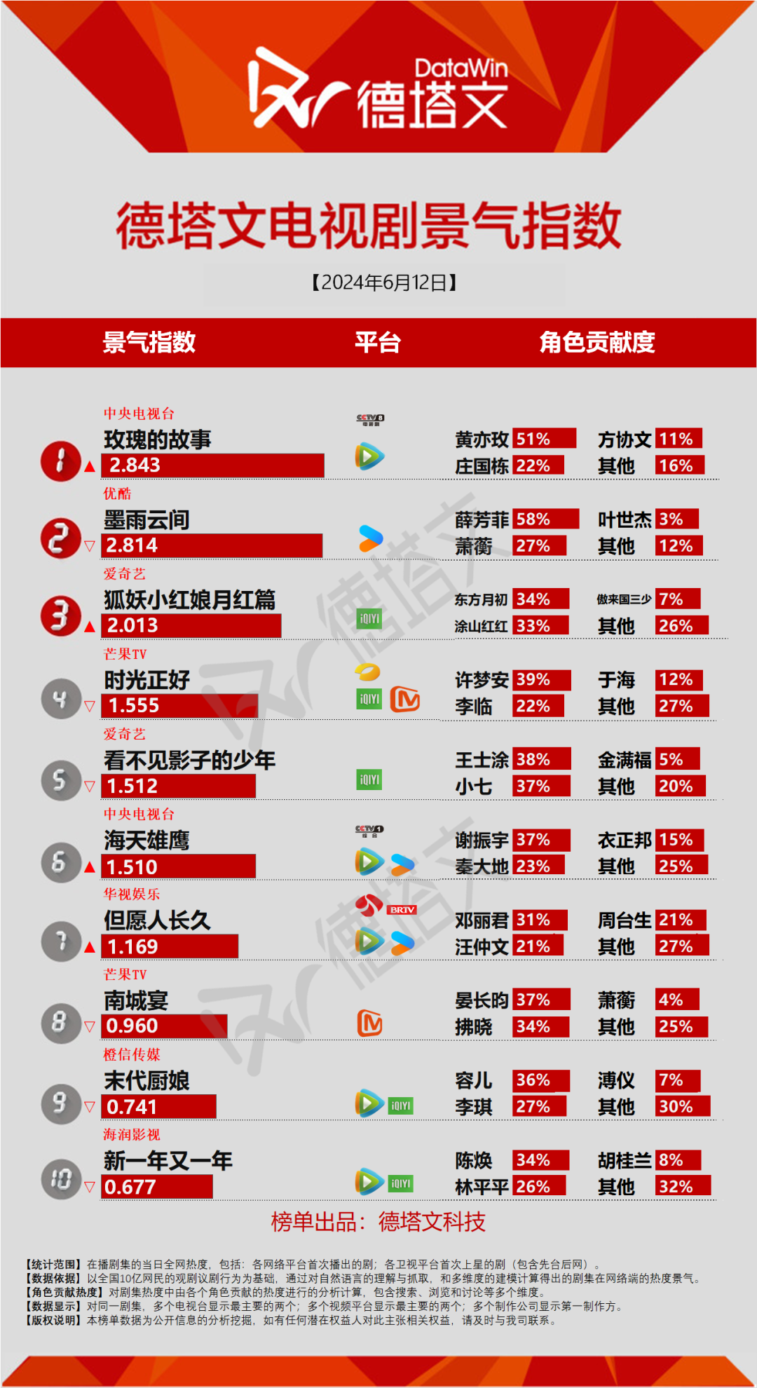 4、数据覆盖首次上星的电视剧和首次播出的网剧。