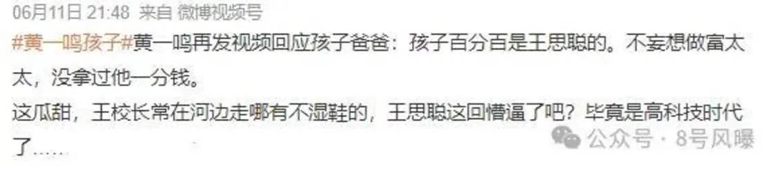 当时曾有网友评论觉得黄一鸣的孩子很像王思聪,但只是在她账号下小范围的讨论,没有闹大。