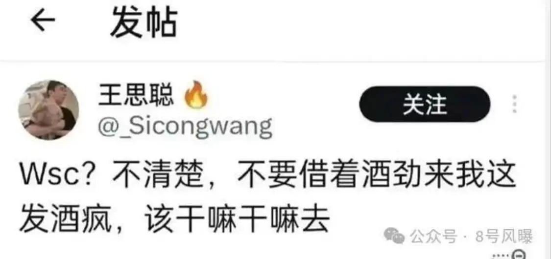 此前疑似王思聪的外网账号曾发文否认孩子是自己的:“Wsc?不清楚,不要借着酒劲来我这发酒疯,该干嘛干嘛去。”
