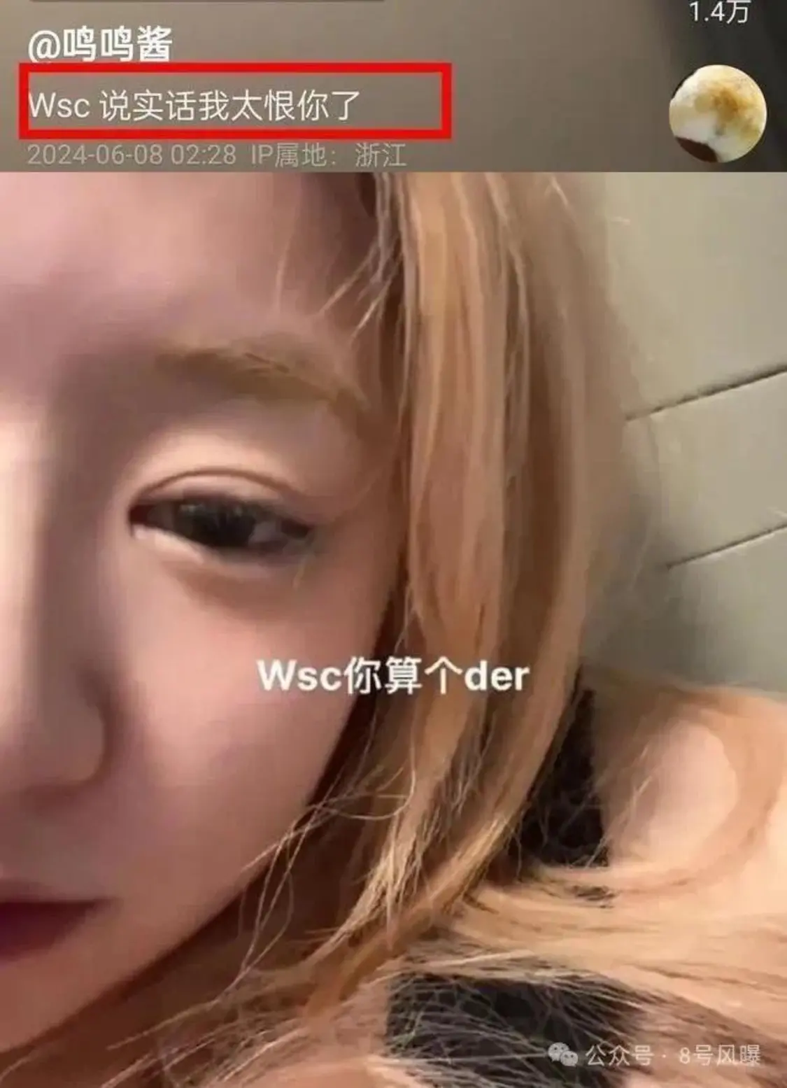 6月8日凌晨,网名叫“鸣鸣酱”的博主,酒醉后发视频吐槽,配文是“Wsc说实话我太恨你了”、“Wsc你算个der”。