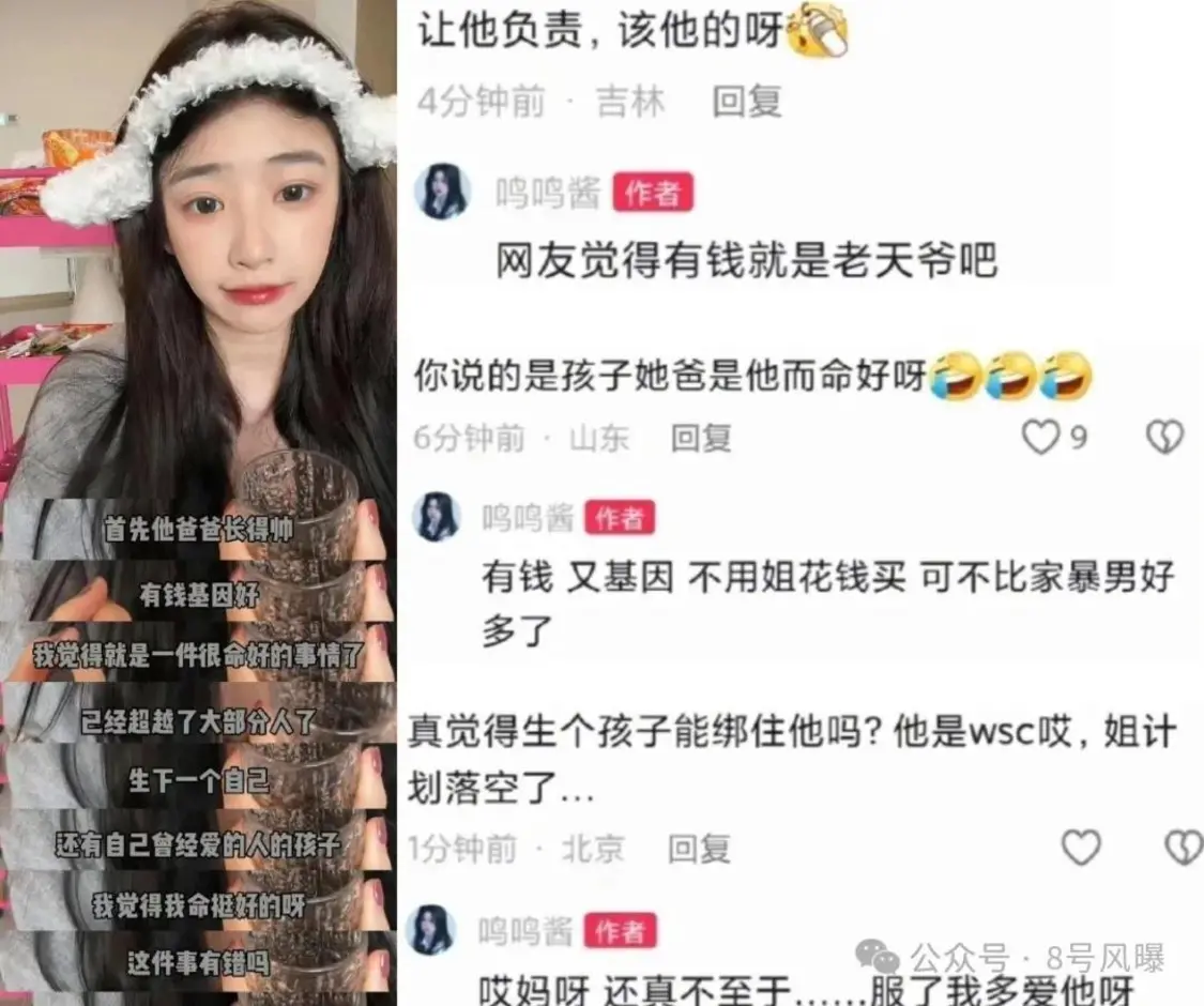 并且,黄一鸣在视频中否认自己想当富太太,表示很清楚“我和他(王思聪)是不会有结果的”,真的是因为自己难受孕,所以才选择留下孩子。