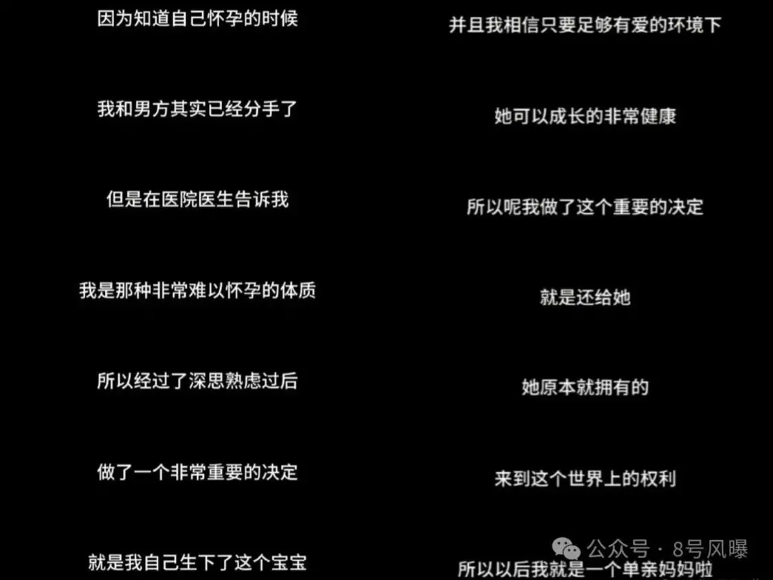 同时,她在视频中表示,自己发现怀孕时和男方已经分手。到医院检查时,黄一鸣被告知自己是难受孕的体质,所以经过深思熟虑,决定生下这个孩子,能够拥有这个孩子对她来说也是非常幸福的事情。
