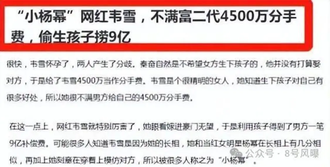 不久后,韦雪就成功怀孕了,秦奋给了她4500万的天价打胎费。韦雪不仅没有把孩子打掉,还在三年后带着孩子回归,“狮子大开口”向秦奋索要9亿的抚养费用。
