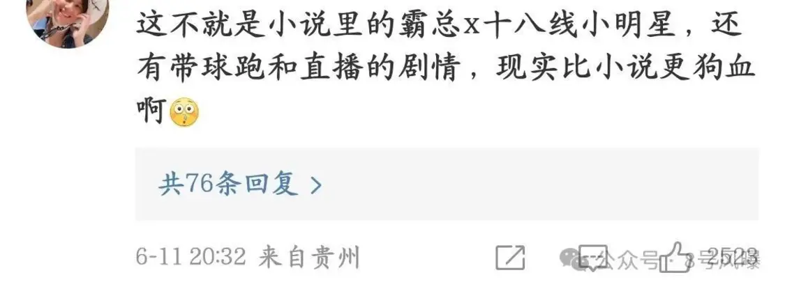 不少网友看热闹不嫌事大,表示:这不就是小说中霸总和十八线小明星恋爱,最后娇妻“带球跑”的故事吗?现实果然比小说更狗血。