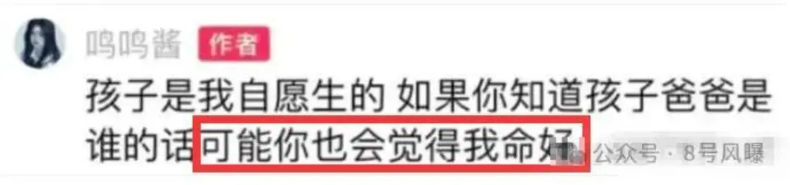 而对于网友针对孩子父亲的疑惑和追问,黄一鸣曾回复“如果你们知道孩子的爸爸是谁,也会觉得我命好”。