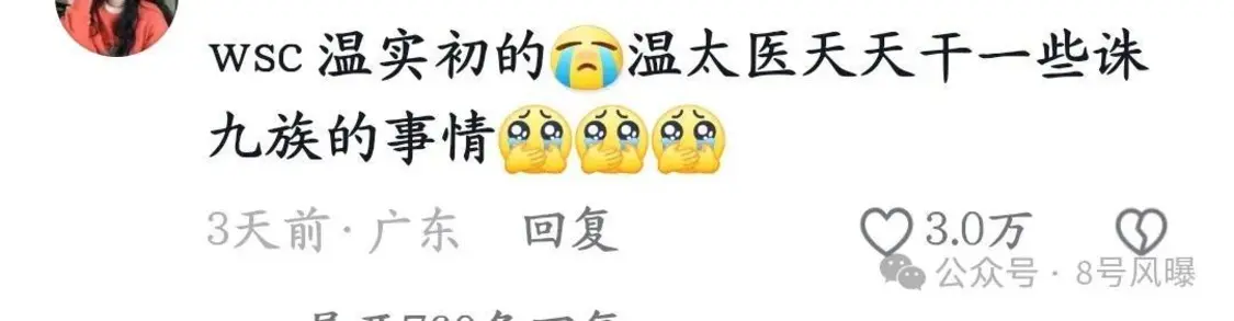 一时间,网友们纷纷开始猜测这个“wsc”是谁,有提名王思聪的,还有人调侃“wsc是温实初的,毕竟温太医天天干一些诛九族的事情”。