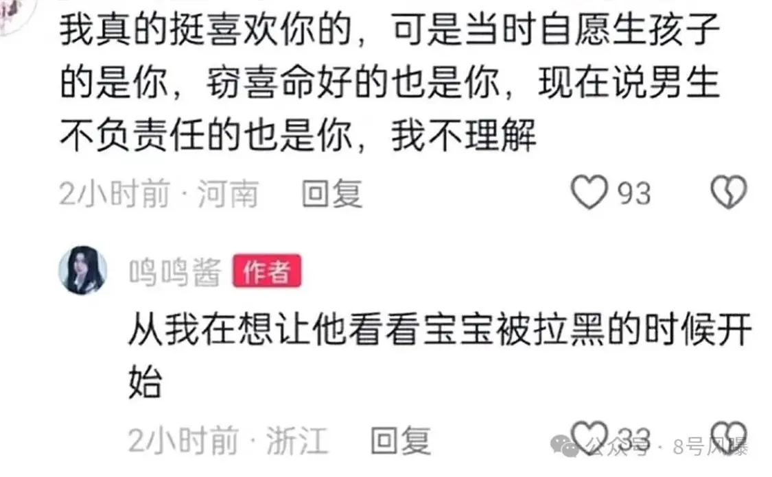 鸣鸣酱回复称:“从我在想让他看看宝宝被拉黑的时候开始”,疑似是男方根本不想承认孩子。
