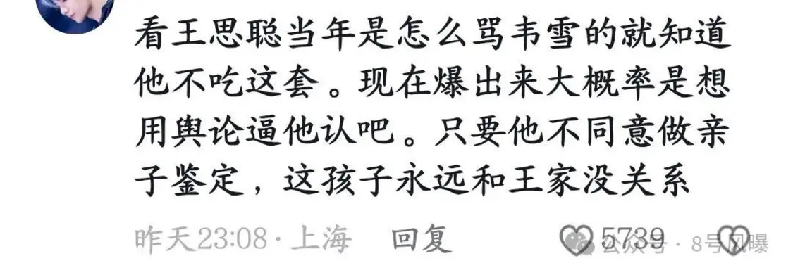 但是网友看他之前对韦雪的态度,认为王思聪明显不吃这套用孩子和舆论来“胁迫承认”的方法。如果他不同意亲子鉴定,孩子也不可能被承认。