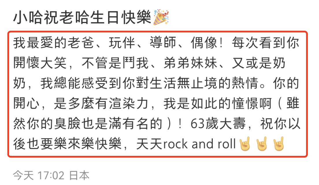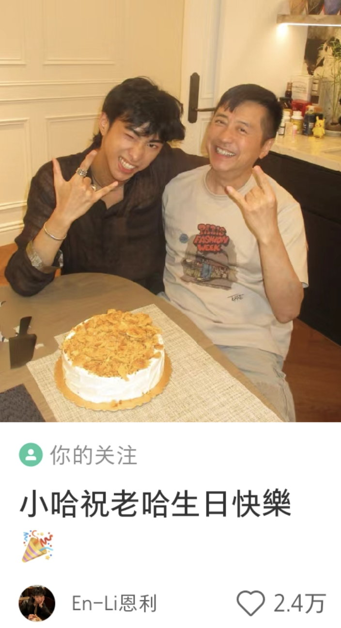 7月28日是庾澄庆的63岁生日,儿子恩利在29日晒出了为爸爸庆生的照片,并称“小哈祝老哈生日快乐”。