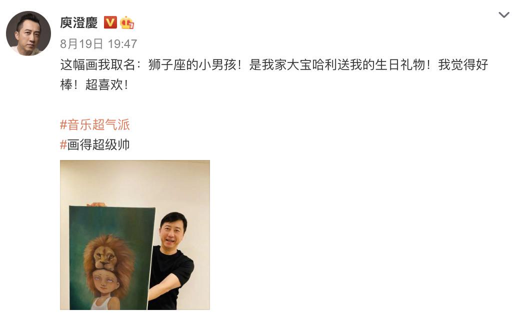有一年,恩利还创作了一幅画送给爸爸,起名为“狮子座的小男孩”,庾澄庆直呼很喜欢。