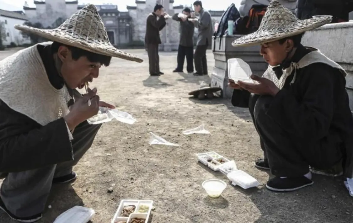 一般剧组,不会给群演提供桌子椅子,基本就是席地而坐,或者蹲下来直接吃,有些年纪大或者身材肥胖的群演,吃一顿饭都会满头大汗。