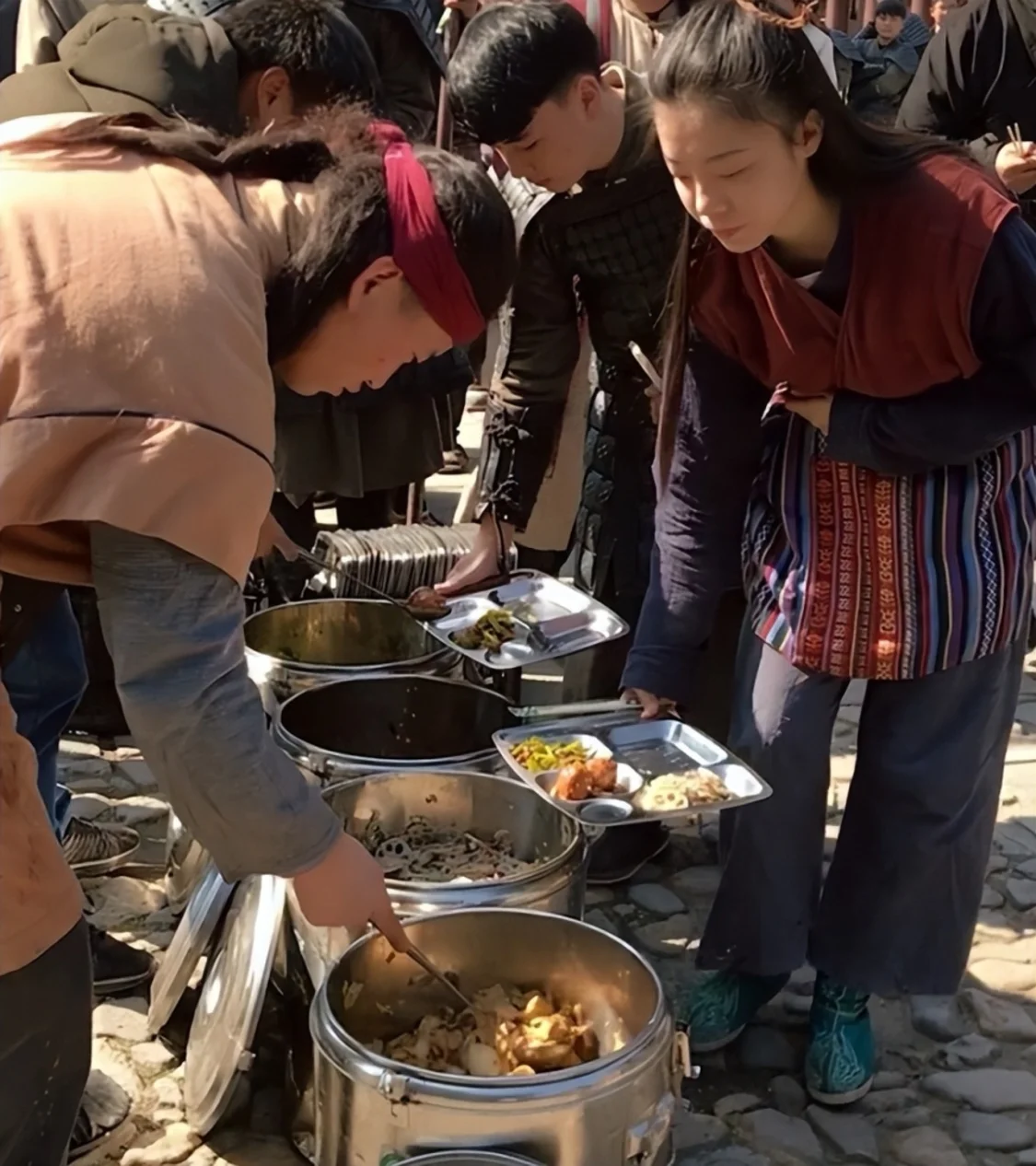 一种是用保温桶运送的大锅饭,运到地方上,再由工作人员分发到每个演员手中。这种饭量大管饱,但口味一般,打多打少,全看打饭人的性格和脸色。