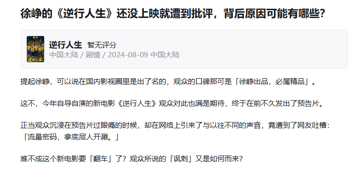 知乎上面就有个问题:“徐峥的《逆行人生》还没上映就遭到批评,背后原因可能有哪些?”,里面有1000多条回答,清一色全是喷这部电影的: