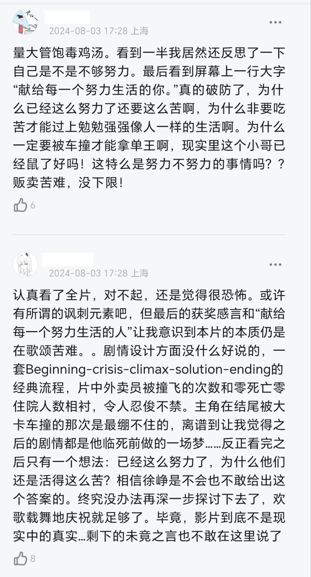 说白了,电影能为弱势群体发声,值得鼓励,但我们不仅需要一部能体现外卖员疾苦的电影,更需要一部能揭示矛盾根源,指出“为啥人到中年就失业”、“外卖员为啥这么苦”的电影。