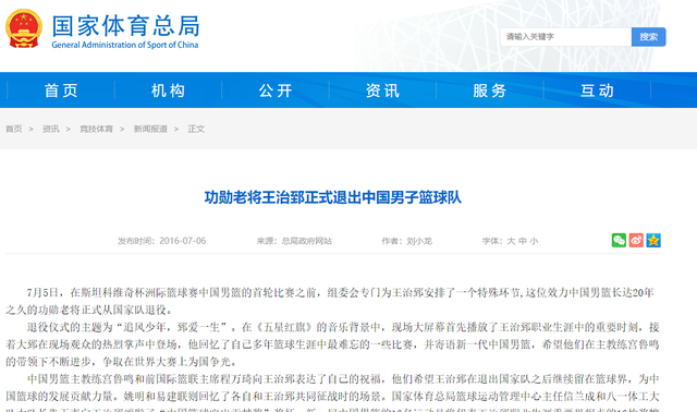 总局政府网站2016-07-06《功勋老将王治郅正式退出中国男子篮球队》