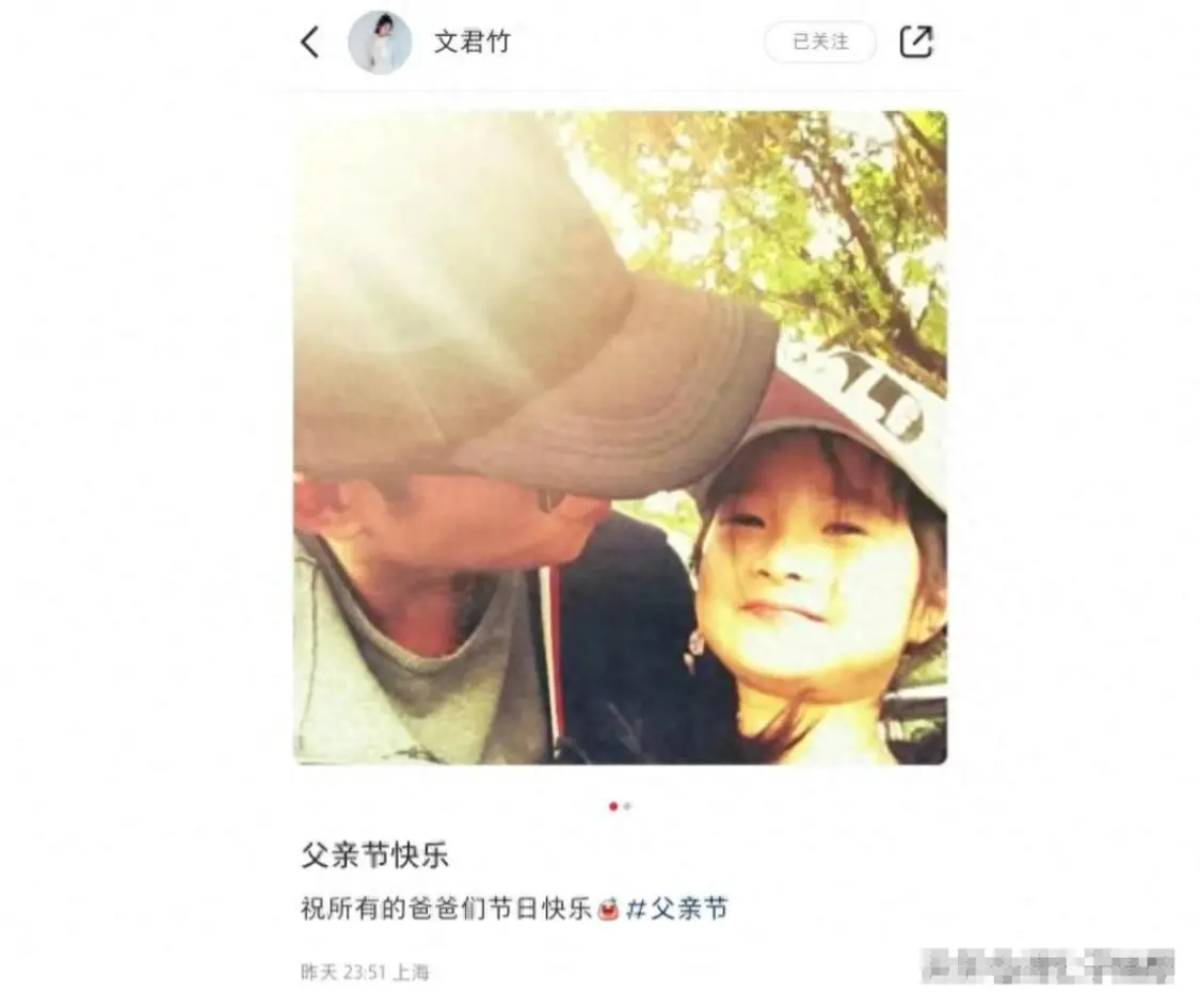 一张是她小时候与文章的合影,戴着棒球帽,一脸天真烂漫地对着镜头微笑。文章则用充满父爱的眼神凝视着女儿,嘟着嘴巴,想要亲吻小君竹的胖嘟嘟的可爱脸蛋;