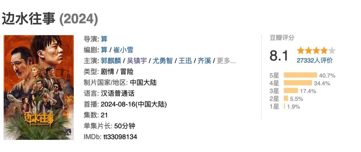 目前,《边水往事》豆瓣开分8.1,高品质好剧的水准已经做实。但是说实话这个口碑相较于目前《边水往事》的热度是不匹配的。