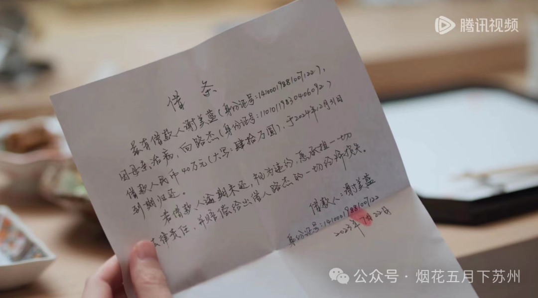 在与老板路总的饭局上,路总拿出了一张借条,上面清楚地写着,由于母亲生病急需用钱,谢美蓝于2023年7月向路总借款40万元,约定于2024年12月底前还款。
