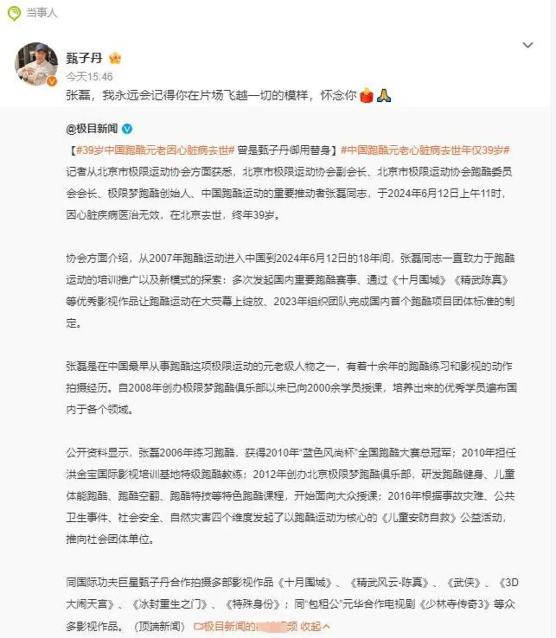 甄子丹随后也发文缅怀张磊:张磊,我永远会记得你在片场飞越一切的模样,怀念你。