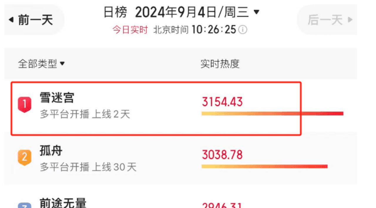 《雪迷宫》首播当天,热度便飙升至该平台榜首。