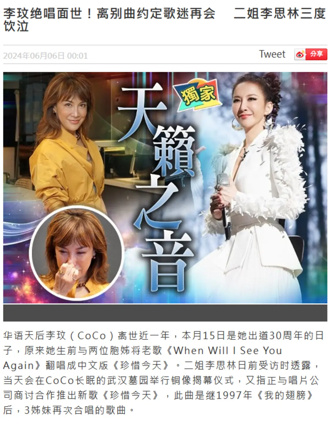 6月6日,据港媒报道,本月15日是李玟出道30周年的日子,她生前与两位胞姐将老歌《When Will I See You Again》翻唱成中文版《珍惜今天》。二姐李思林日前受访时透露,当天会在CoCo长眠的武汉墓园举行铜像揭幕仪式。李思林还表示:“这首歌2017年就已经录好,MV也已经有了,团队设计了3个人物,代表我们三姐妹。大姐香菇头,我是长头发,李玟扎小辫子,好像打游戏机相互帮忙排除了万难,借此教导小朋友爱护环境。”