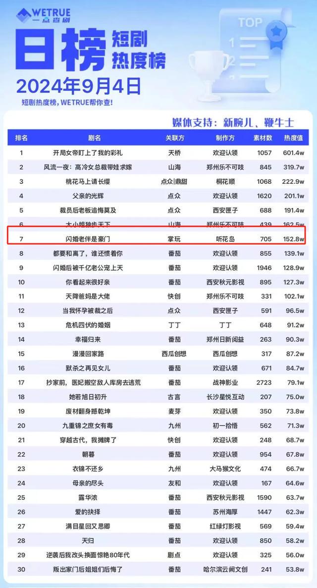 9月4日,《闪婚老伴是豪门》热度便降至第七