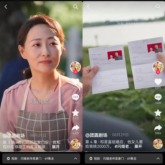 53岁的集团董事长雷志远隐藏身份,换上空调修理工的衣服,假装自己月薪三千,和摆摊卖盒饭的49岁阿姨石小秀相亲,随即被石小秀的善良质朴感动,当场求婚——短剧才到第4集,播了不到8分钟,男女主角就已经领了结婚证。