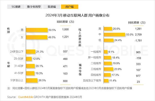 QuestMobile发布的《2024中国移动互联网春季大报告》则显示,移动互联网人群中女性用户增长,增量贡献超过男性,50岁以上的银发人群则是成为移动互联网增量的重要贡献人群:截至今年3月,51岁及以上的用户增量达600万,占据互联网总增量的26.5%。复旦大学老龄研究院发布的《中国银发经济发展研究报告》则显示,预计2035年银发经济规模将达到19万亿元。