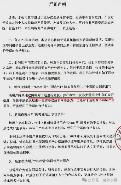说这位网友持续窥视于适,发布了大量虚假的信息。