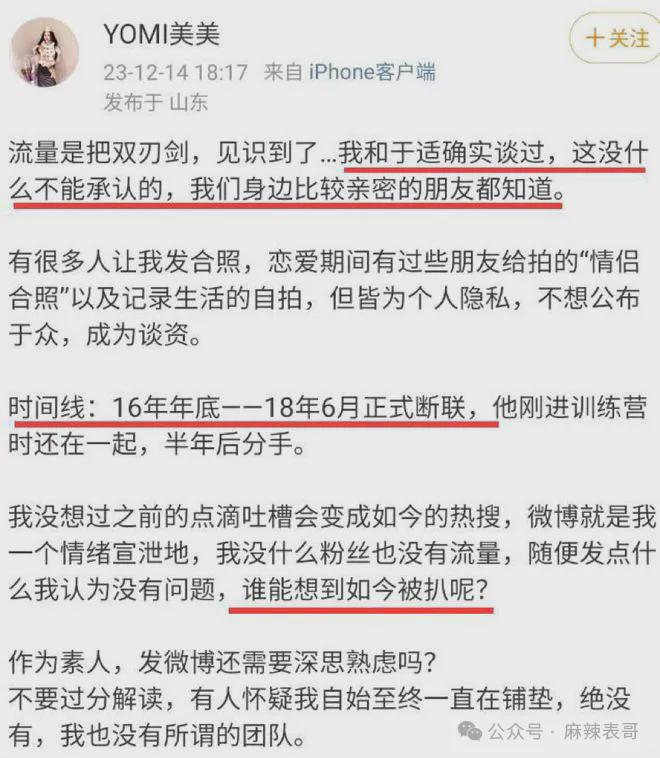 YOMI美美回应,自己和于适2016年底谈到2018年,于适进训练营,两人就分了。