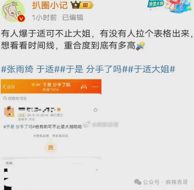粉丝破防也阻止不了八卦的发酵,张雨绮下场后,有关于适的八卦像被压抑多年的火山,一下子全喷发了。