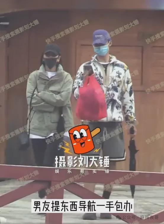 第二天,两人去逛公园,男友提包包,张雨绮在旁边。