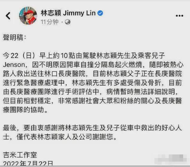虽然林志颖的车辆被烧毁,但父子俩幸运地捡回了一条命,只是林志颖这次似乎受伤比之前更严重。